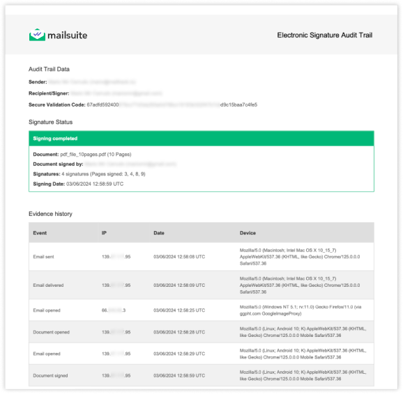 Receive a full audit trail that verifies each signature. You’ll know who signed the document, when they signed it, and their location, including the IP address and device. This can serve as proof in legal disputes and compliance checks.