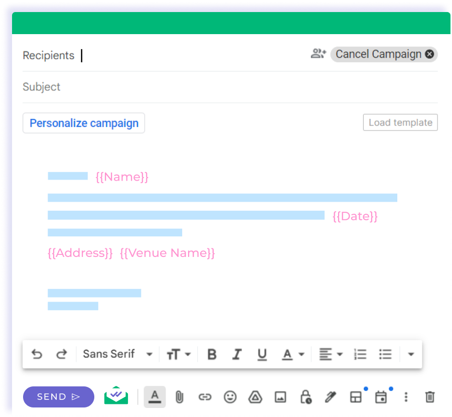 Write an eye-catching subject line and a useful message to engage with your contacts. You can personalize both with Mailsuite.