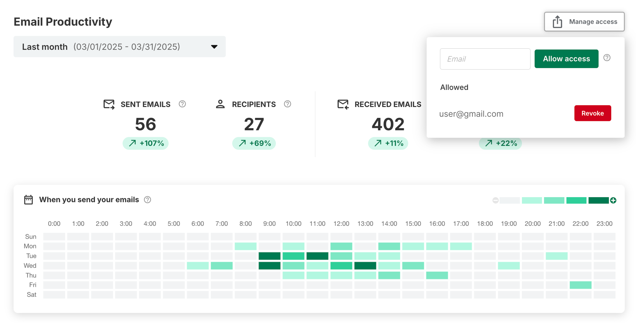 Easily share your personalized productivity analysis report with just one click. Manage access to your dashboard by sending it via email, and revoke access at any time.